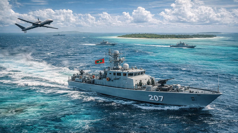 यह कदम सीधे तौर पर इंटरनेशनल ट्रिब्यूनल फॉर द लॉ ऑफ द सी (आईटीएलओएस) के फैसले को चुनौती देता है। मालदीव रक्षा मंत्रालय ने बताया कि मालदीव नेशनल डिफेंस फोर्स (एमएनडीएफ) ने एक विशेष निगरानी अभियान शुरू किया है। इस ऑपरेशन में कोस्ट गार्ड जहाज ‘धरमवंथा’ और एयर कॉर्प्स के ड्रोन तैनात किए गए हैं। यह अभियान 4 फरवरी से शुरू हुआ और दक्षिणी बेसलाइन से 200 नॉटिकल मील तक फैले समुद्री क्षेत्र में संचालित किया जा रहा है।